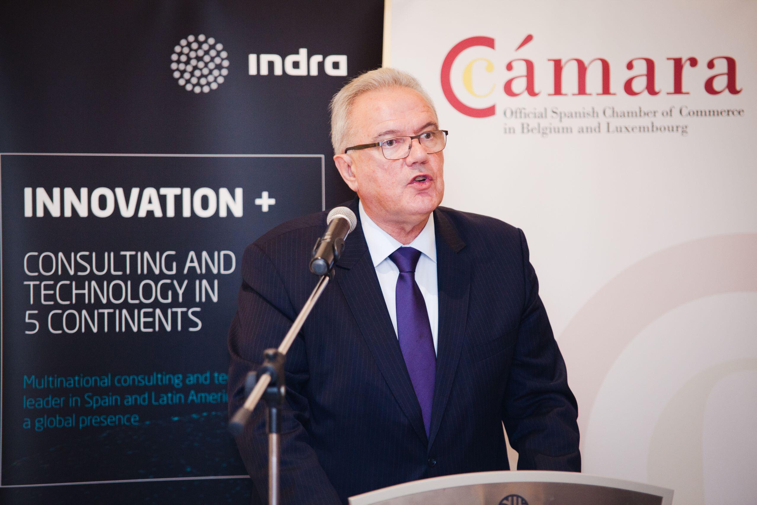 El acto finalizó con la entrega de un obsequio a Neven Mimica por parte de la Cámara e Indra en reconocimiento a su labor como comisario de Cooperación Internacional y Desarrollo.
