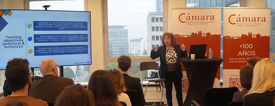 Este lunes, 7 de octubre, la Cámara Oficial de Comercio de España en Bélgica y Luxemburgo celebró en su sede un desayuno conferencia impartido por Karine Brück, socia fundadora de Karine Brück International, bajo el título “¿Deberíamos presentar una licitación o participar en un proyecto? Oportunidades europeas al alcance de su organización”.